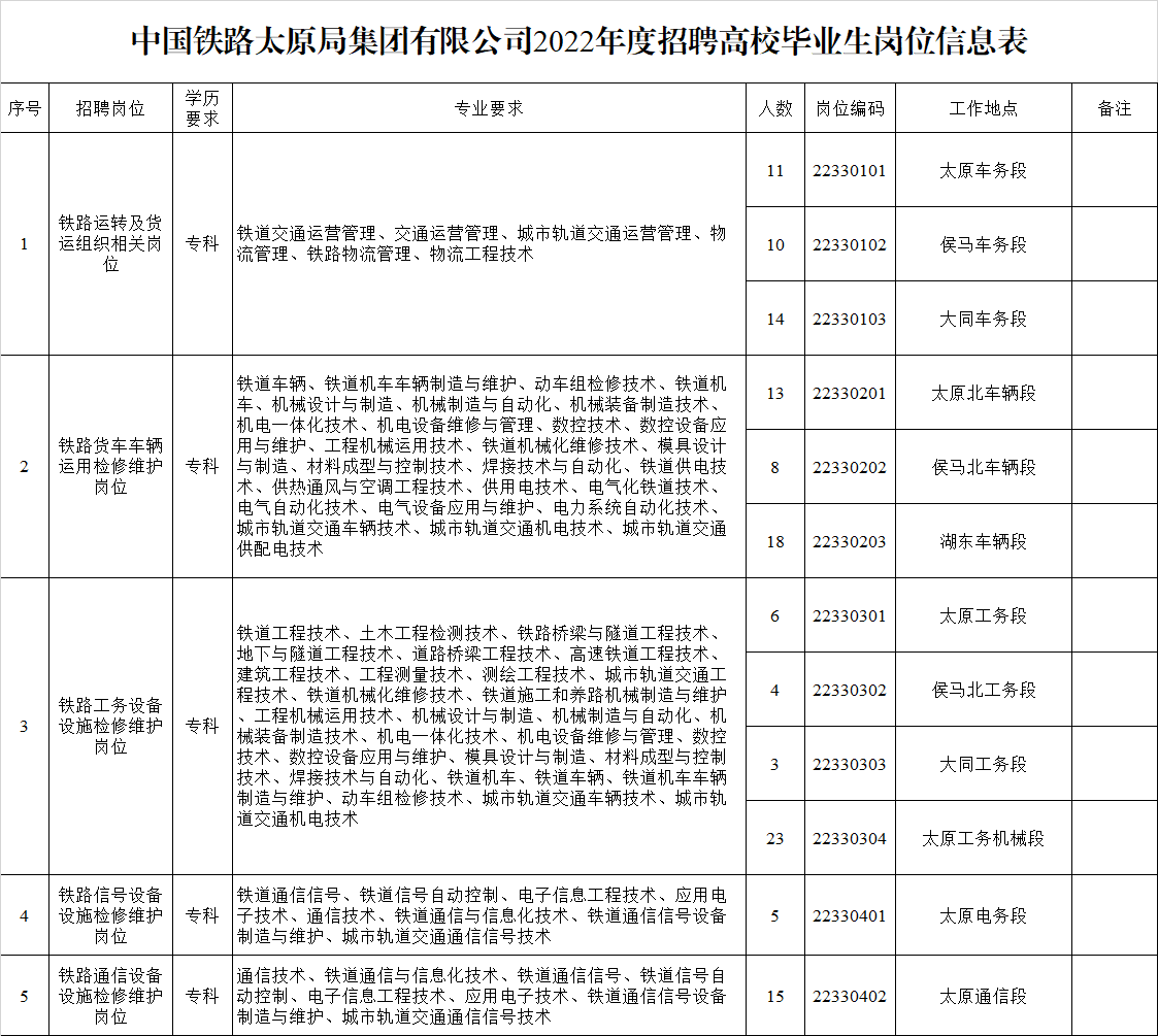 招聘崗位、學(xué)歷、專業(yè)、人數(shù)和工作單位等內(nèi)容詳見(jiàn)《中國(guó)鐵路太原局集團(tuán)有限公司2022年度招聘高校畢業(yè)生崗位信息表》。
