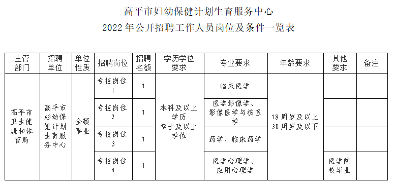 附件:高平市婦幼保健計劃生育服務(wù)中心2022年公開招聘工作人員崗位及條件一覽表