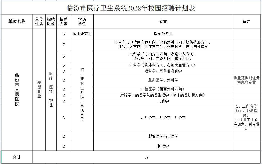 2022-01-10 00:30:47閱讀()臨汾市人民醫(yī)院為加強(qiáng)我院醫(yī)療專業(yè)技術(shù)人員隊伍建設(shè),根據(jù)《事業(yè)單位人事管理條例》以及我省《關(guān)于進(jìn)一步改進(jìn)和加強(qiáng)事業(yè)單位公開招聘工作的意見》、《關(guān)于深化高等院校、科研院所、公立醫(yī)院人事管理改革有關(guān)事項的通知》等相關(guān)要求,開展2022年校園招聘工作,擬招聘37名工作人員,現(xiàn)公告如下: