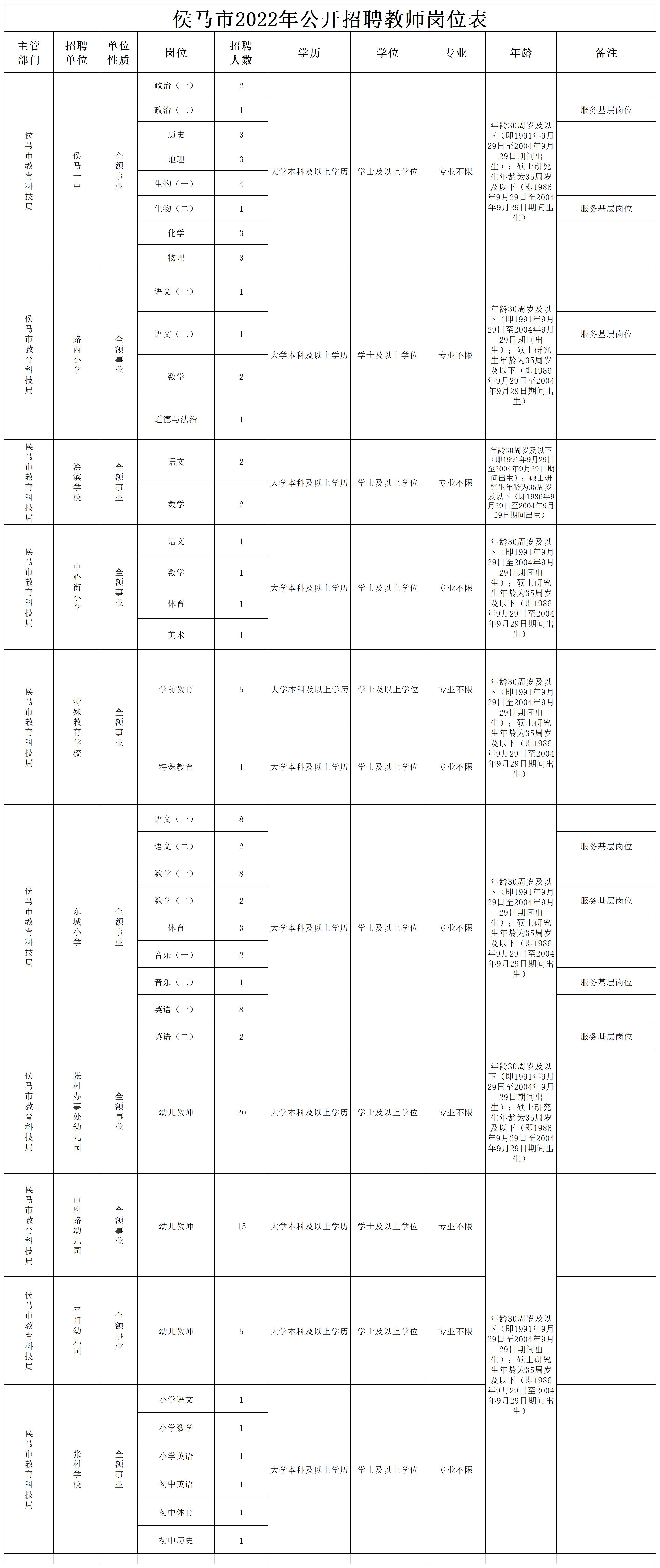 侯馬市2022年公開招聘中小學(xué)、幼兒園教師121名。各招聘崗位所需的具體條件以《侯馬市2022年公開招聘教師崗位表》(見附件,以下簡稱《崗位表》)的要求為準。