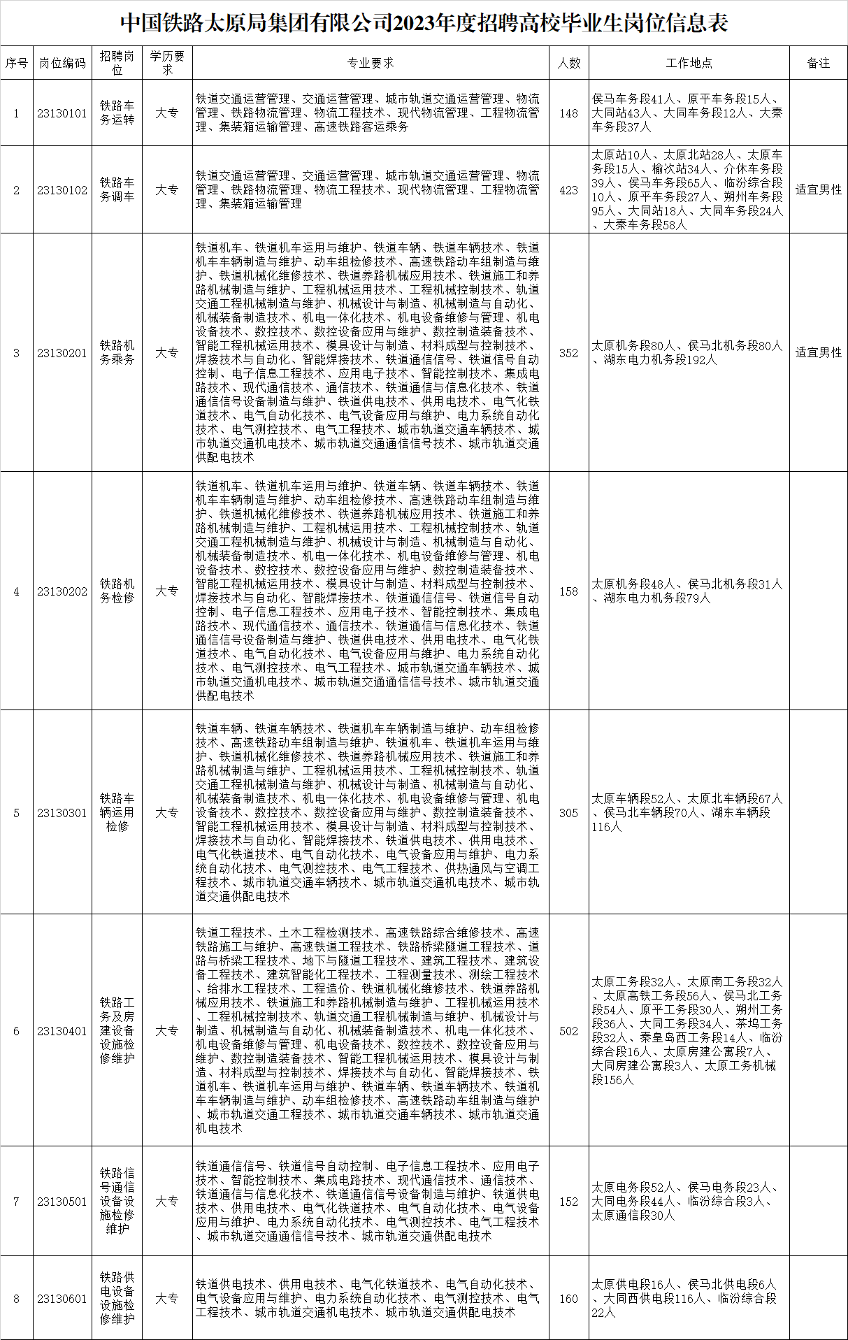 2022-11-30 22:02:02閱讀()中國鐵路太原局集團(tuán)有限公司根據(jù)企業(yè)發(fā)展需要,現(xiàn)將2023年全日制普通高等職業(yè)院校高職(大專)畢業(yè)生招聘有關(guān)事項(xiàng)公告如下: