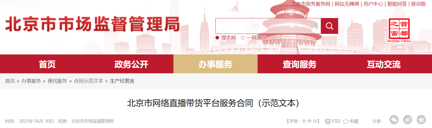 據(jù)北京市市場監(jiān)督管理局7月8日消息,北京市市場監(jiān)督管理局正式發(fā)布《北京市網(wǎng)絡(luò)直播帶貨平臺服務(wù)合同(示范文本)(試行)》。該文本系全國首個 ...