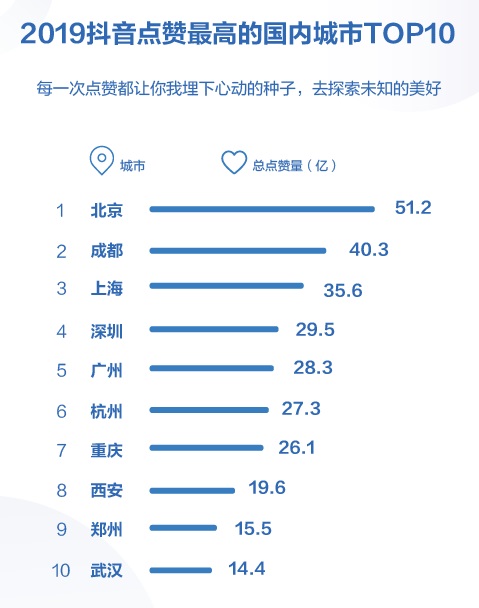 2020-01-07 12:59:00閱讀()抖音2019年,抖音上點贊最多的城市是哪個?最火的景點在哪里?最流行的音樂、貼紙是什么?不同年齡段用戶喜歡拍攝的內(nèi)容有何變化?1月6日,抖音發(fā)布《2019抖音數(shù)據(jù)報告》(以下簡稱“報告”),對以上問題進行了解讀。