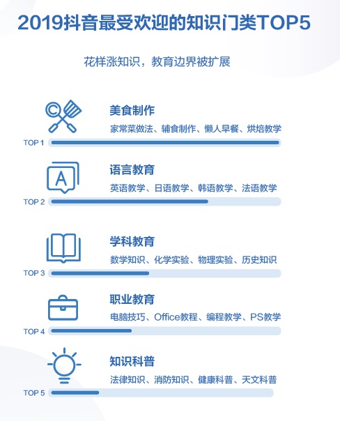 報告顯示,知識類視頻正成為抖音內(nèi)容生態(tài)的重要組成部分。2019年,抖音萬粉知識創(chuàng)作者發(fā)布1489萬個視頻,1.3億用戶聽過@向波老師的化學課。最受歡迎的知識門類是美食制作,人們在抖音學習家常菜、輔食、懶人早餐和烘焙等烹飪技巧,其次為語言教育、學科教育、職業(yè)教育和知識科普,滿足各類人群的學習需求。