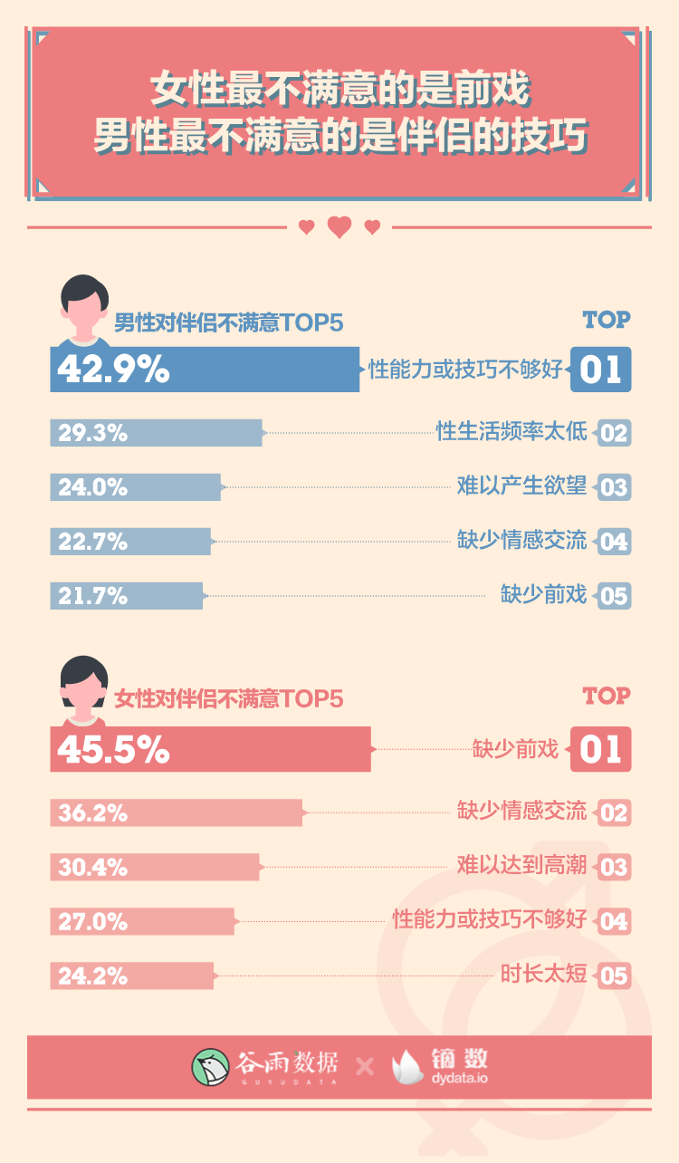 在對伴侶不滿意的各項(xiàng)原因里,讓女性最不滿意的是“缺少前戲”,讓男性最不滿意的是“性能力或技巧不夠好”。