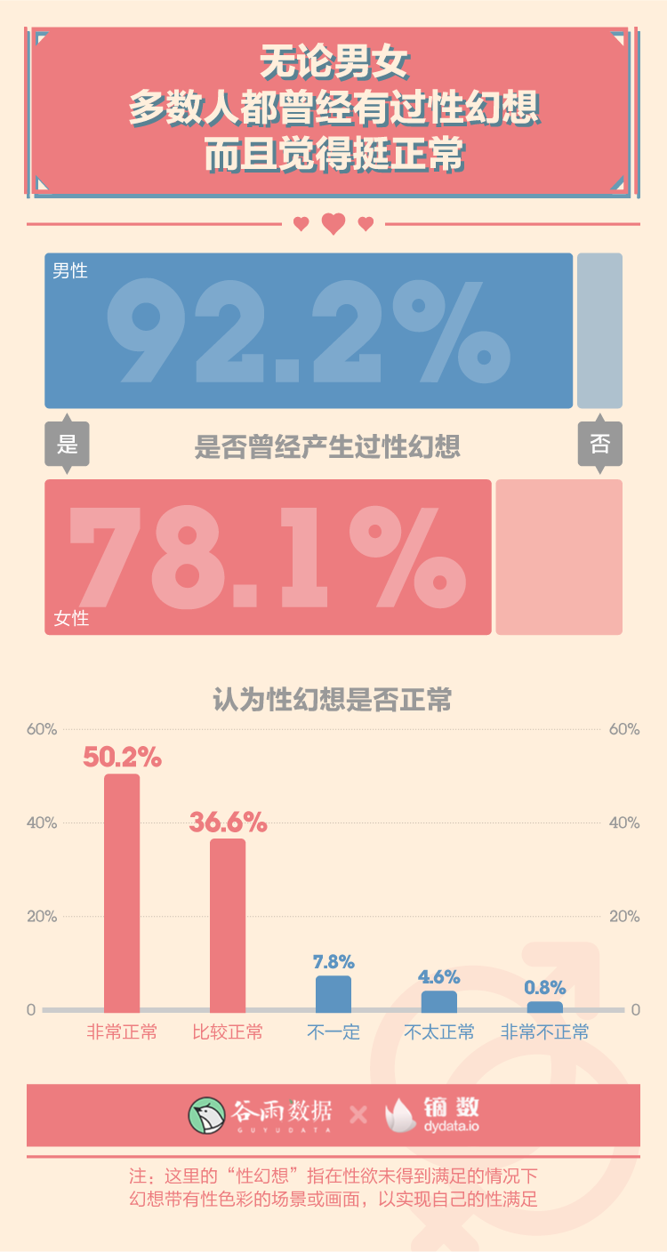 在我們的調(diào)查中,無論男女,多數(shù)人都曾經(jīng)有過性幻想,男性產(chǎn)生過性幻想的比例超過了九成,更高一些。