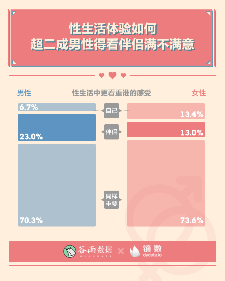 在我們的調(diào)查中,超過七成的人認(rèn)為性生活中自己和伴侶的感受同樣重要,但分性別看,男性比女性更看重伴侶的感受。