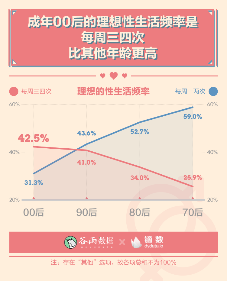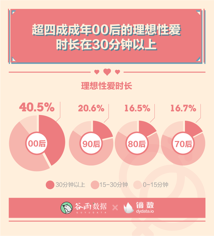 年輕的身體里裝著更加旺盛的性需求。超四成的成年00后理想性生活頻率是每周三四次,理想性愛時長在30分鐘以上,這兩個比例都比其他年齡更高。