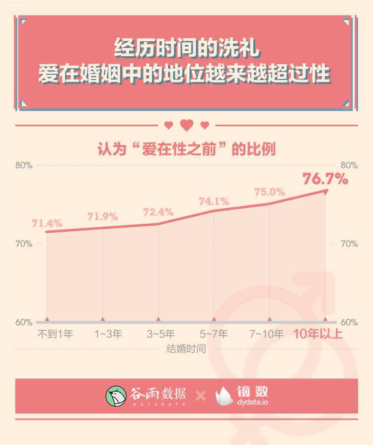 在所有結(jié)婚時間段中,結(jié)婚10年以上的人認(rèn)為“愛在性之前”的比例達(dá)到最高,為76.7%。