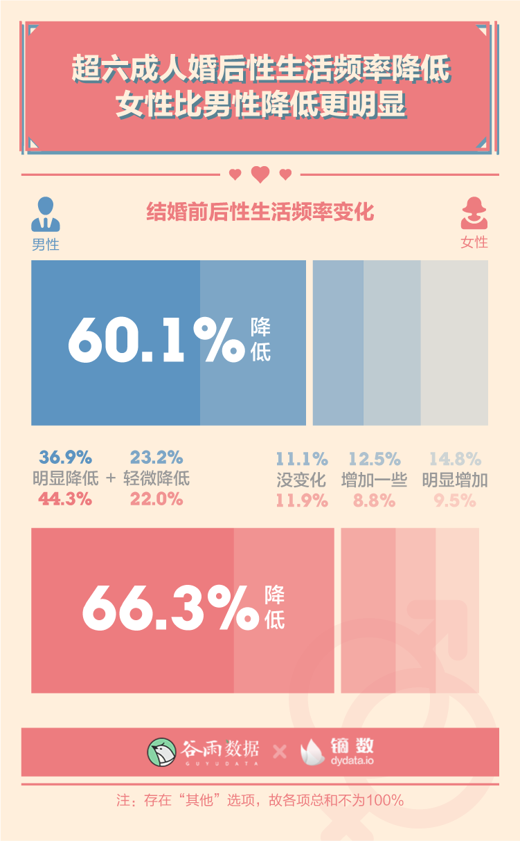 多數(shù)情況下,結(jié)婚會讓性生活更少,尤其對女性而言。60.1%的男性、66.3%的女性在結(jié)婚之后性生活頻率降低。