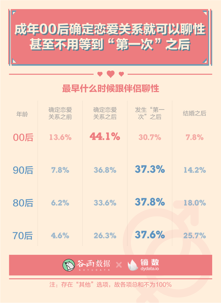 在性表達(dá)方面,00后的開放程度的確也更高。44.1%的成年00后認(rèn)為確定戀愛關(guān)系就可以聊性,而其他年齡段更傾向認(rèn)為要等到發(fā)生“第一次”之后。