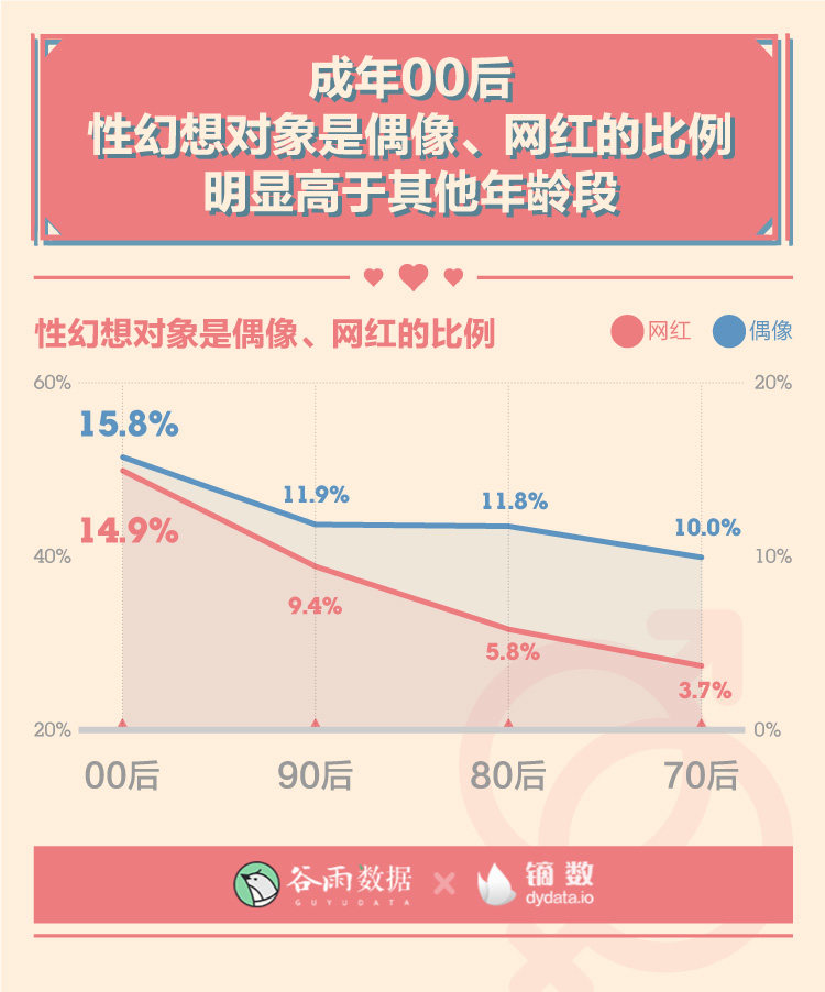 另外,作為網(wǎng)絡(luò)時代的“土著”,成年00后們性幻想對象是偶像、網(wǎng)紅的比例也明顯高于其他年齡段。