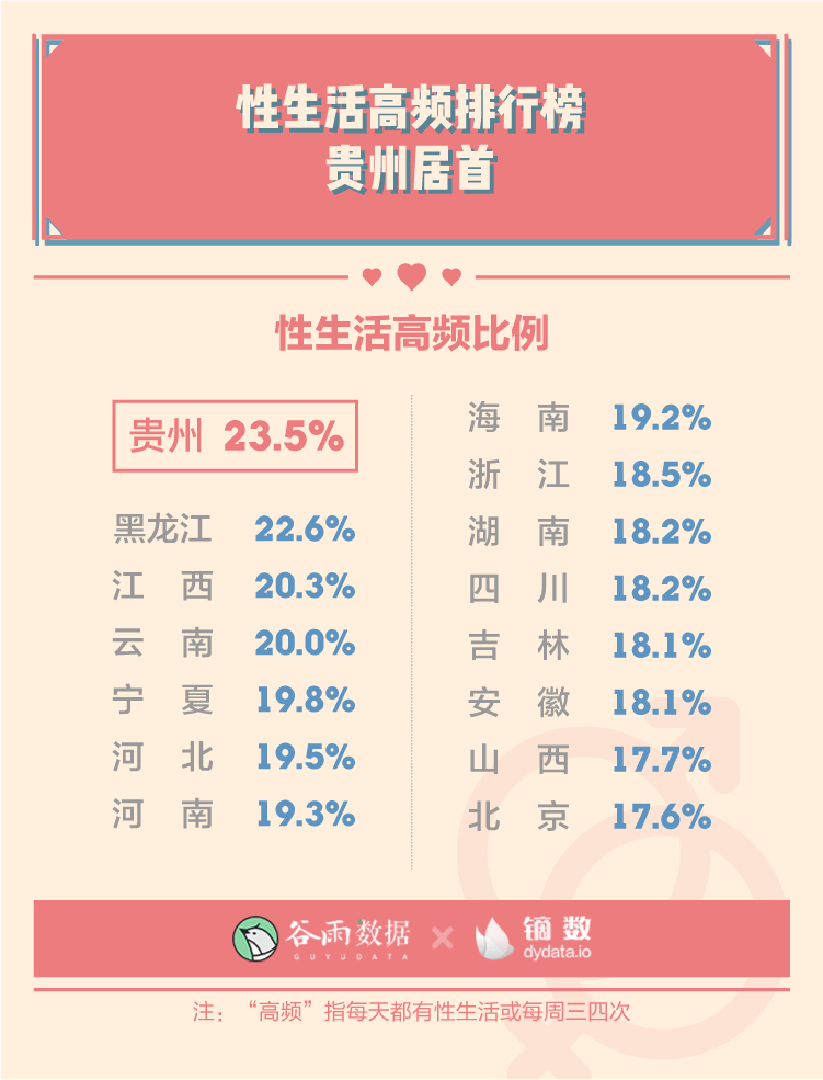 在谷雨數(shù)據(jù)2019年的調(diào)查中,貴州省56.1%的人每周都有性生活,這一比例高居各地區(qū)榜首,而今年……性生活頻率排行榜中,貴州人民再次榮登榜首。