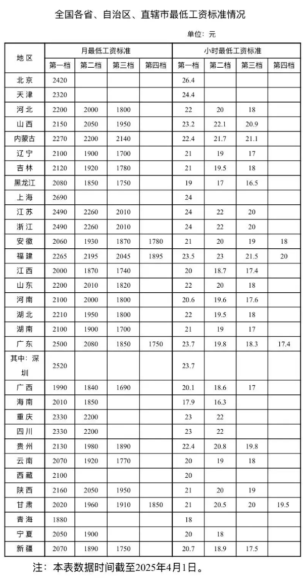 2025-04-06 16:59:43閱讀()中國(guó)新聞網(wǎng)人力資源和社會(huì)保障部4月3日發(fā)布了全國(guó)各省、自治區(qū)、直轄市最低工資標(biāo)準(zhǔn)情況(截至2025年4月1日)。數(shù)據(jù)顯示,目前有21個(gè)省份第一檔月最低工資標(biāo)準(zhǔn)在2100元及以上,有8個(gè)省份第一檔月最低工資標(biāo)準(zhǔn)超過2300元。