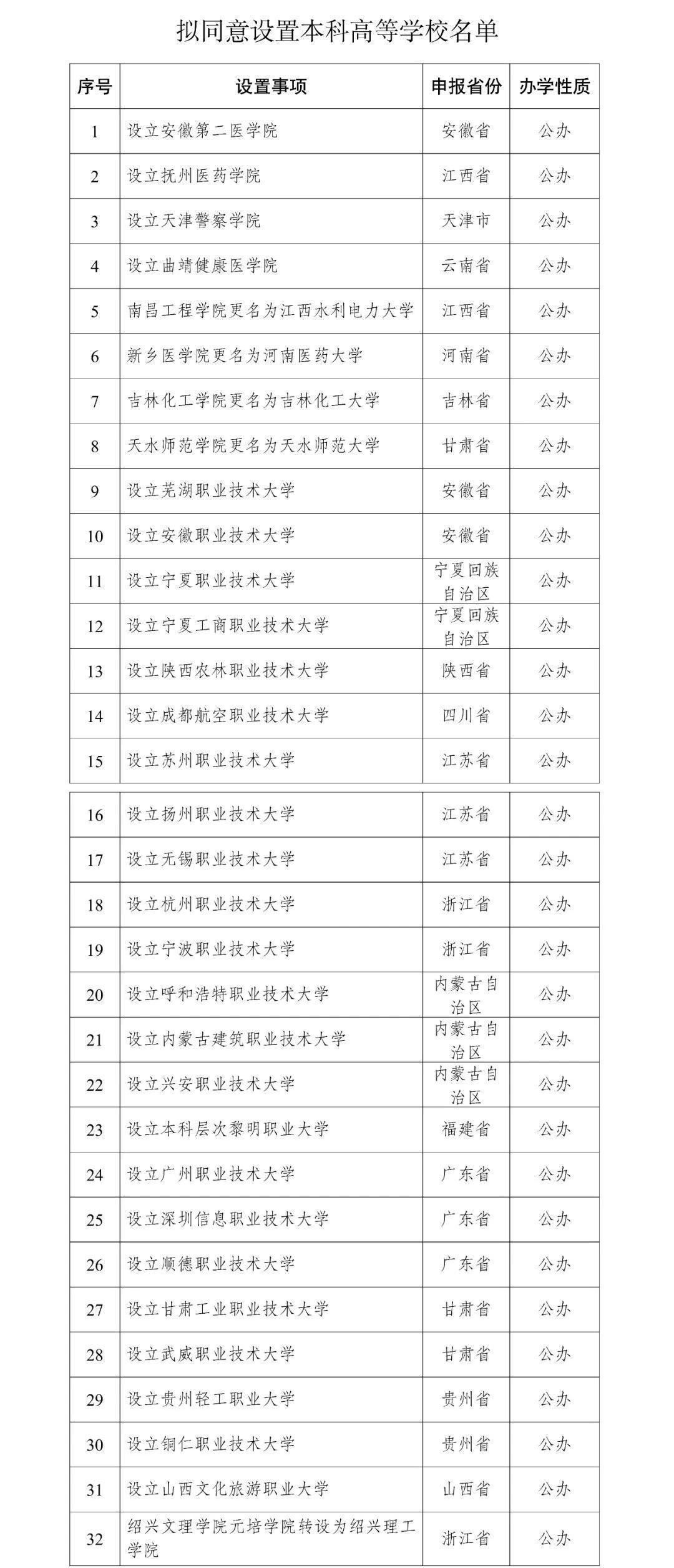 根據(jù)《中華人民共和國高等教育法》《普通高等學校設置暫行條例》《普通本科學校設置暫行規(guī)定》《本科層次職業(yè)學校設置標準(試行)》等有關規(guī)定以及第八屆全國高等學校設置評議委員會考察評議結(jié)果,經(jīng)教育部黨組會議審議,擬同意設置安徽第二醫(yī)學院等32所學校,現(xiàn)予公示。