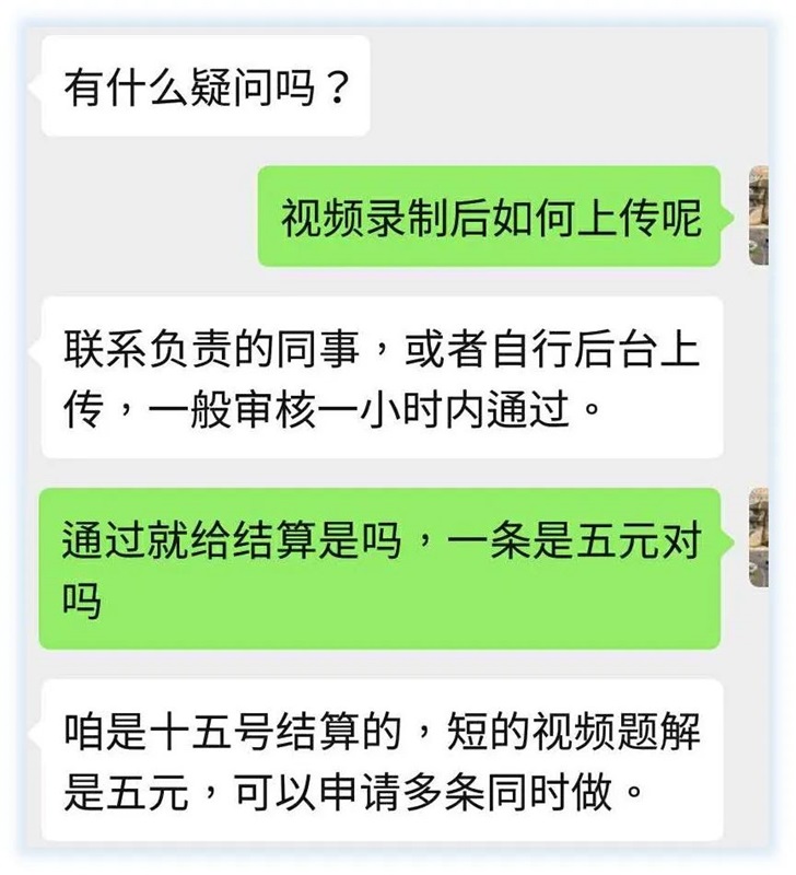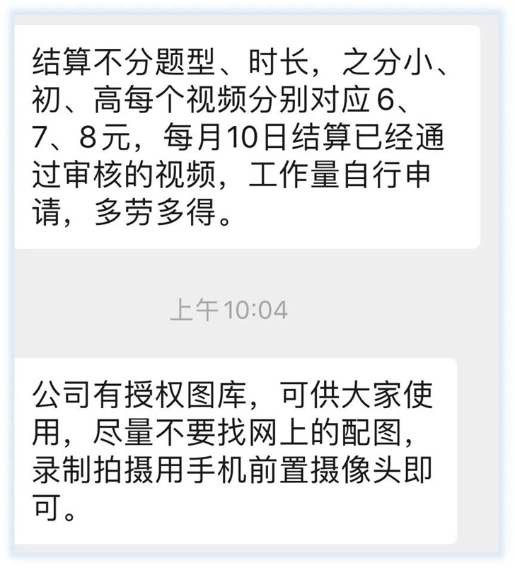 另一家位于寧波的在線教育機構(gòu)更是開出了超低的薪酬,“大家可以多錄些視頻,如果通過的話,文科短視頻每條5元,理科短視頻是6元。”群里一位負責(zé)統(tǒng)籌的工作人員如是說。