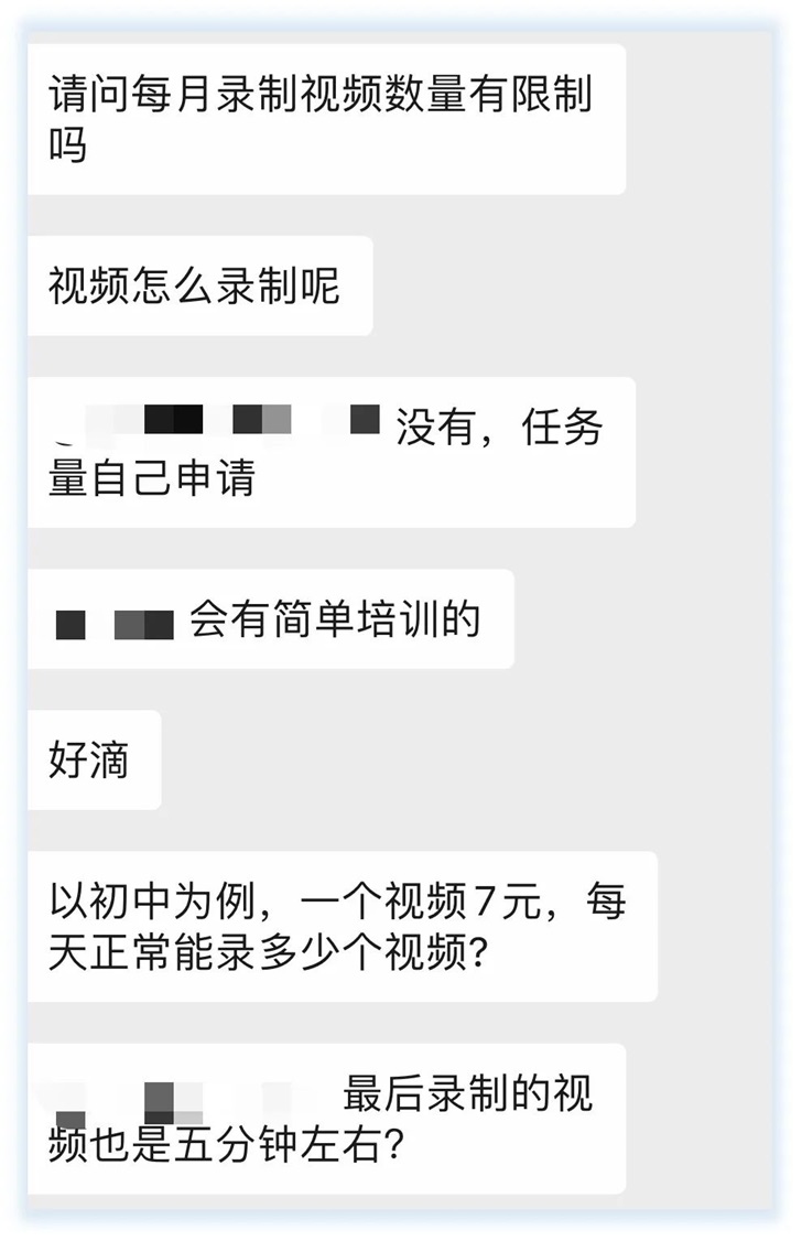 “反正宅在家也沒什么事情做,就錄錄視頻賺點兒錢唄,畢竟很簡單嘛。”群里一位應(yīng)聘者私下表示,自己的公司一直沒有復(fù)工,他無聊之下就投了簡歷進了群,“很多內(nèi)容照著兒子的課本講一講,再上網(wǎng)查查講義就行了,一條幾元也是錢呀。”