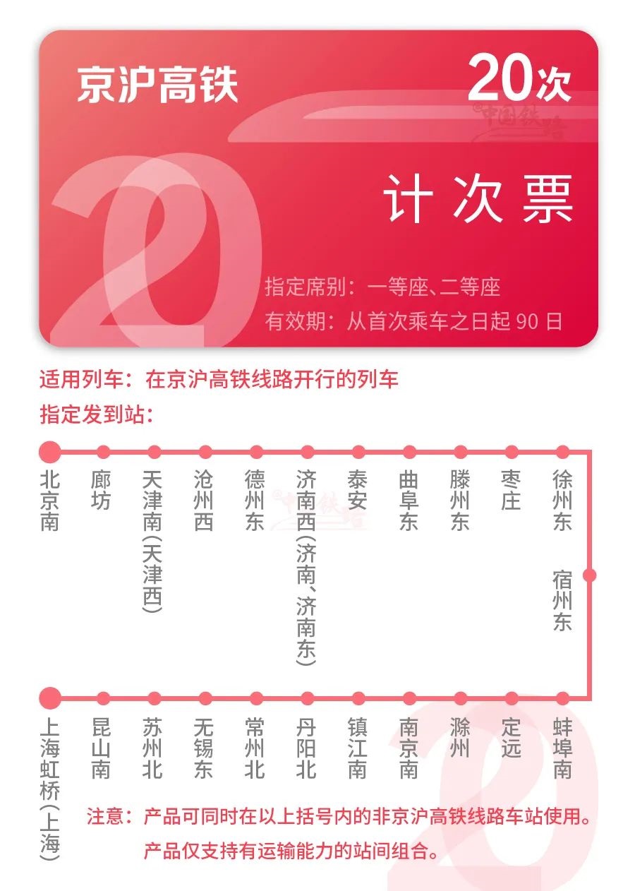 京滬高鐵全程一等座計次票20次/90天售價18880元,平均每次票價為944元,處于日常票價 884-1006 元之間。