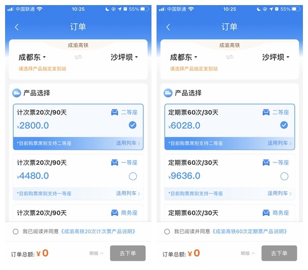 而成渝高鐵普通票商務(wù)座價格在 460-495 元之間,一等座在 250 元左右,二等座在 150 元左右。如果足額利用乘車次數(shù),相較于二等座最貴的 168 元票價,一張定期票可以節(jié)省原價的 40% 。