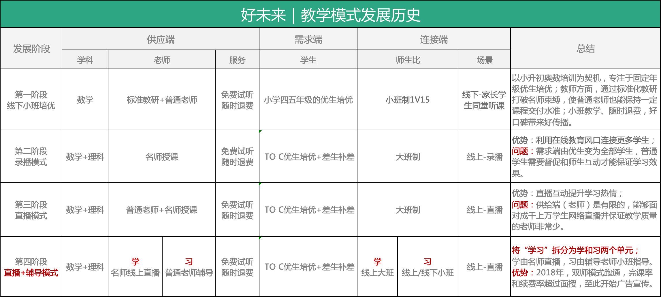 第四階段(直播+輔導):這一階段學而思將學習拆分為“學”和“習”,學的部分由名師線上直播,習的部分由輔導員線上或線下小班指導。名師直播能連接更多學生,小班輔導保證學習質量。2018年,雙師模式跑通,完課率和續(xù)費率超過面授,至此學而思開始對網(wǎng)校飽和式宣傳。
