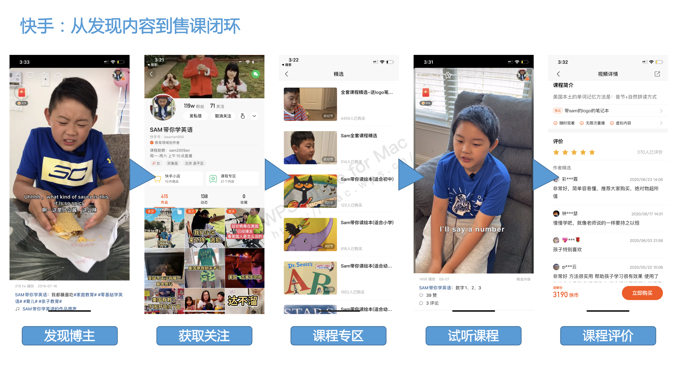 短視頻降低教育內容創(chuàng)作門檻,幫助個體賦能。快手上一位年僅9歲的小學生網(wǎng)紅SAM,通過情景英語教學吸引大量粉絲,并在快手課程中上傳了自己閱讀兒童繪本的音頻,面向幼兒到初中生,售價幾十到幾百元不等。微博、小紅書等平臺上,各領域KOL也形成了粉絲經(jīng)濟,玩偶圈改妝大神二十天教學課程高達38000元,依然供不應求。