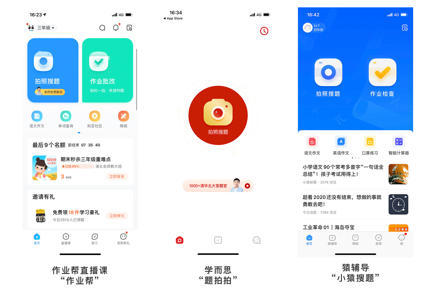 目前作業(yè)幫、學而思、猿輔導等品牌均對拍照搜題做了布局。通過這個環(huán)節(jié)可以用自家圈起來的流量持續(xù)做轉化。