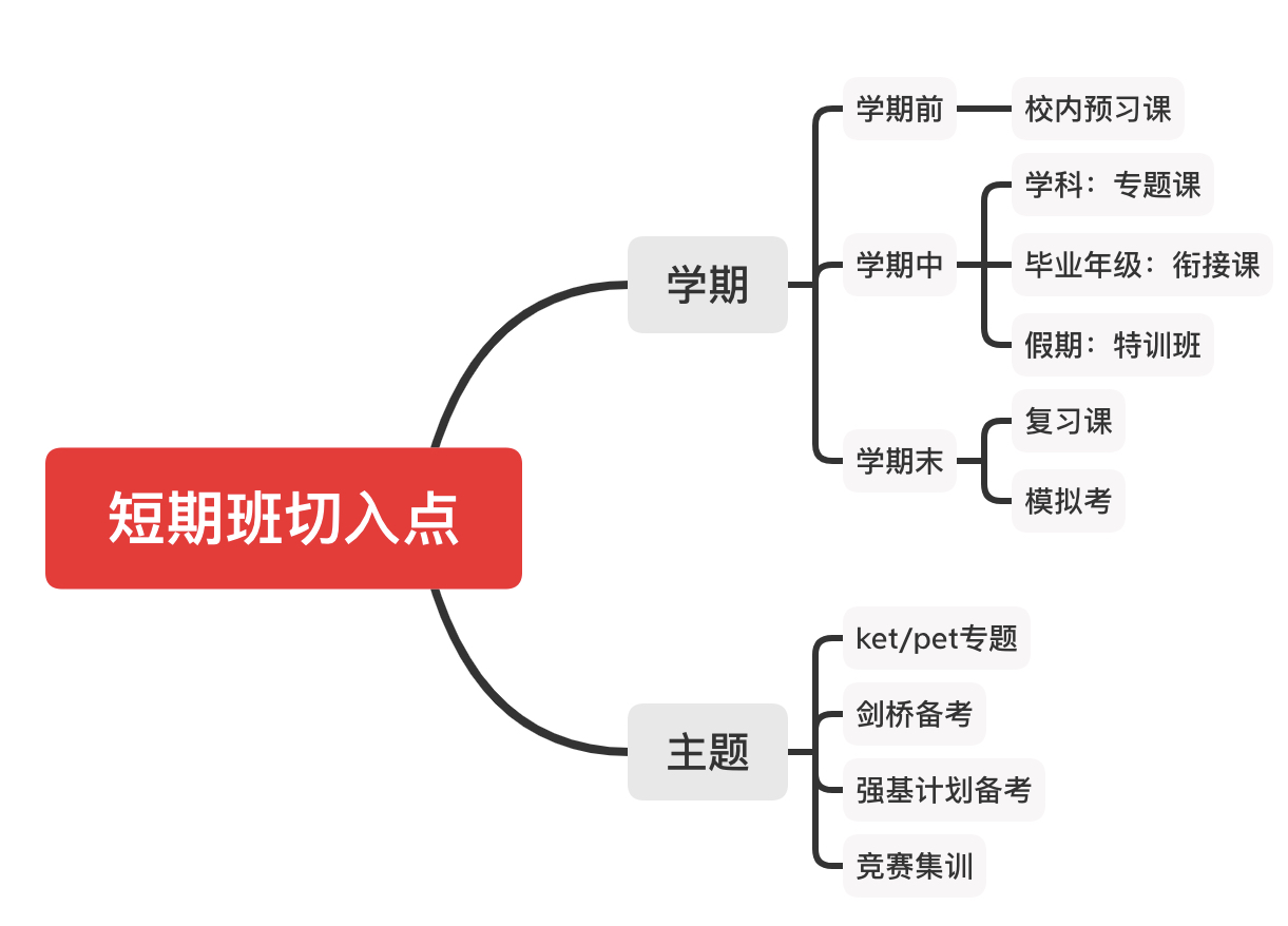 短期班是以「試聽課」為出發(fā)點,感受老師(教學風格、實力等)、產(chǎn)品(課程質量、使用實用工具等)、服務(答疑、資料等)等多個方面。基于主要的知識點包裝個短期班,也會根據(jù)時期匹配試點課的內容,比如劍橋備考,給一個觸手去接觸到用戶。