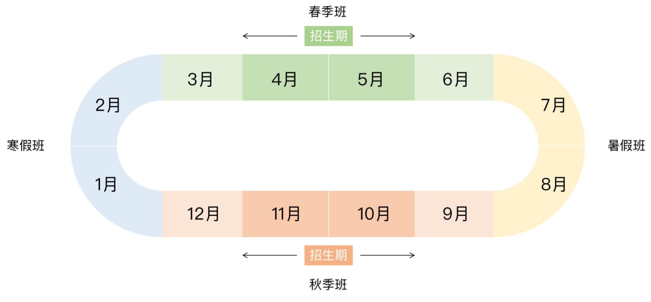 目前國內的k12教育課外培訓以補充課內和提升為主,所以在課程時間安排、課程內容的設置都與公立校有緊密的聯(lián)系。在春/秋季班只能都得在課余時間參加培訓,所以3-6月和9-12月的課程基本在工作日的晚上和周末開展。而暑/寒假班是校內放假階段,所以7-8月和1-2月則可以全天參與培訓。
