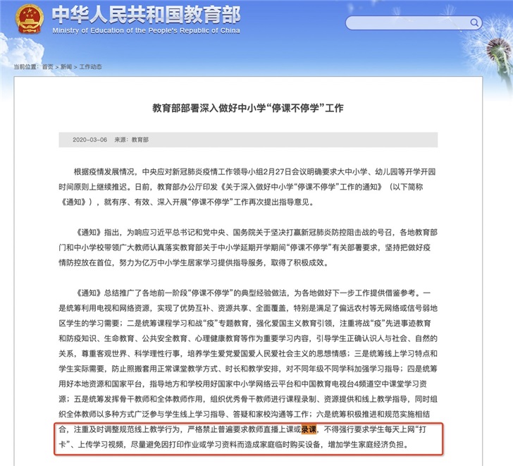 2020-03-07 10:40:54閱讀()教育部國家教育部在3月6日發(fā)布了名為《教育部部署深入做好中小學“停課不停學”工作》,其中要求嚴格禁止普遍要求教師直播上課或錄課,不得強行要求學生每天上網“打卡”、上傳學習視頻。
