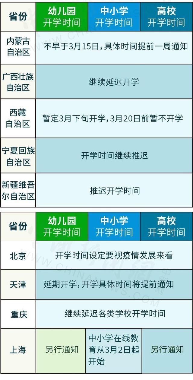 2020-03-10 12:52:07閱讀()中國(guó)新聞網(wǎng)一圖看明白!31省份開學(xué)時(shí)間一覽表,隨著疫情往好的方向發(fā)展,截止2020年3月10日已經(jīng)有幾個(gè)省、自治區(qū)相繼清零,各中小學(xué)高校也開始做好開學(xué)準(zhǔn)備,下圖來(lái)自中國(guó)新聞網(wǎng)匯總的“31省份開學(xué)時(shí)間一覽表”