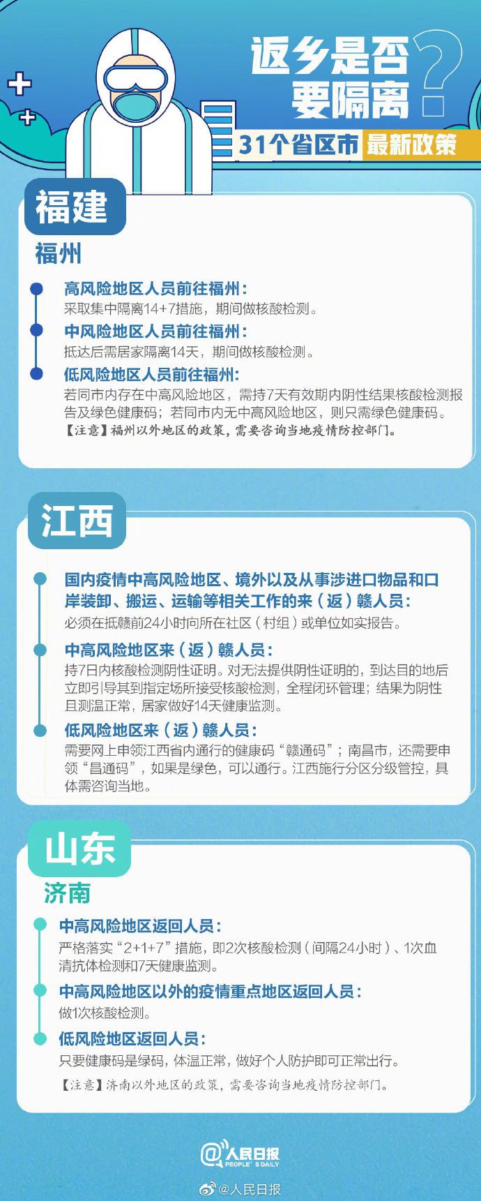中、高風(fēng)險(xiǎn)地區(qū)人員倡議不返鄉(xiāng),若返鄉(xiāng)需要定點(diǎn)集中隔離14日;低風(fēng)險(xiǎn)地區(qū)人員來福州只需要提供健康碼綠碼。