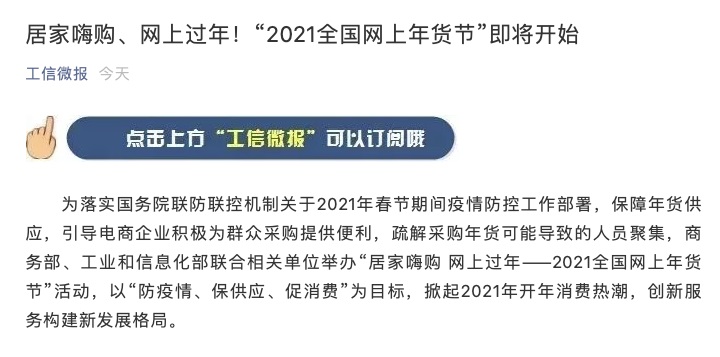 商務(wù)部與工信部將推 “2021 全國(guó)網(wǎng)上年貨節(jié)”:各電商企業(yè) “統(tǒng)一時(shí)間、統(tǒng)一標(biāo)識(shí)”