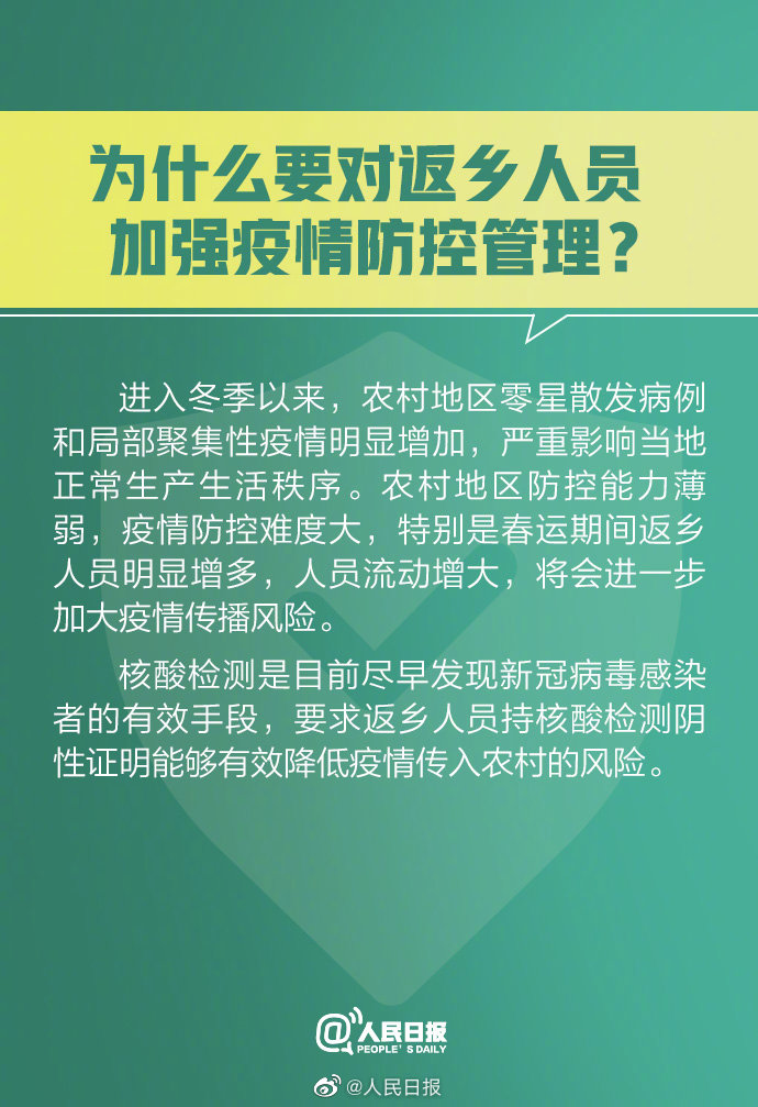 為嚴格落實內(nèi)防反彈的防控策略,對返鄉(xiāng)人員加強疫情防控管理十分必要。核酸檢測是目前盡早發(fā)現(xiàn)新冠病毒感染者的有效手段,要求返鄉(xiāng)人員持核酸檢測陰性證明能夠有效降低疫情傳入農(nóng)村的風(fēng)險,保障大家度過一個健康、平安的春節(jié)。