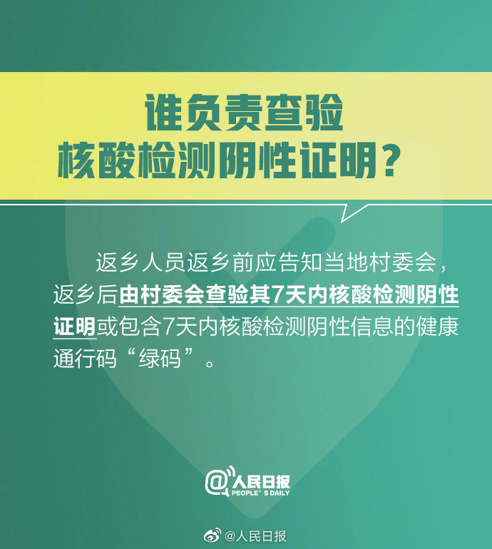 返鄉(xiāng)人員返鄉(xiāng)前應(yīng)告知當(dāng)?shù)卮逦瘯掂l(xiāng)后由村委會查驗其7天內(nèi)核酸檢測陰性證明或包含7天內(nèi)核酸檢測陰性信息的健康通行碼“綠碼”。