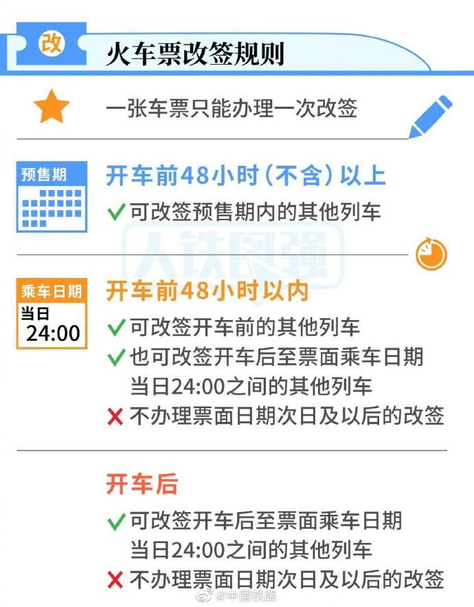 中國(guó)鐵路官宣:火車(chē)票改簽更方便了,開(kāi)車(chē)當(dāng)日24時(shí)前尚有余票情況下仍可辦理改簽