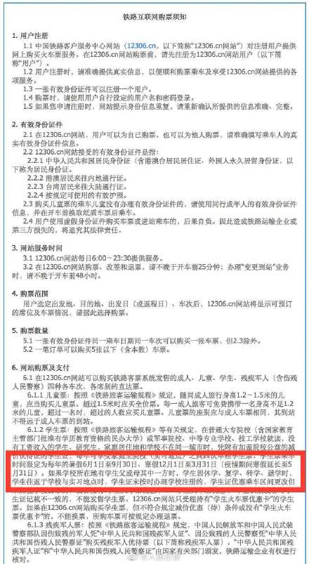 2020-03-15 20:39:35閱讀()123063月15日消息 中國(guó)鐵路12306官方網(wǎng)站近日更新《鐵路互聯(lián)網(wǎng)購(gòu)票須知》:疫情期間,學(xué)生票寒假的乘車時(shí)間已由12月1日至3月31日延長(zhǎng)至5月31日。