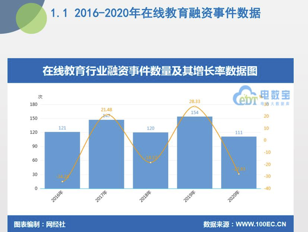 2020 年,資本對于在線教育的狂熱程度,可以從一組數(shù)據(jù)中看出端倪。根據(jù)網(wǎng)經(jīng)社電子商務研究中心發(fā)布的《2020 年度中國在線教育投融資數(shù)據(jù)報告》(以下稱 “報告”),2020 年中國在線教育領(lǐng)域共發(fā)生 111 起融資,同比下降 27.93%。