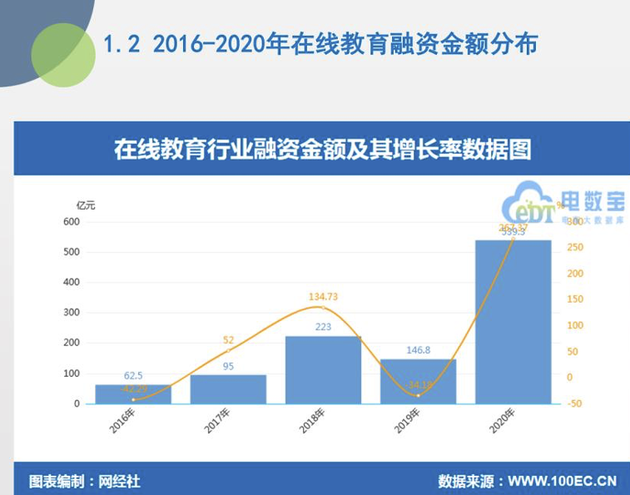 但是,在線教育領(lǐng)域的融資總額卻達到了歷史高位,融資總額超過 539.3 億元,同比增長 267.37%。這一總額比 2016 年到 2019 年四年的融資總額都要多。