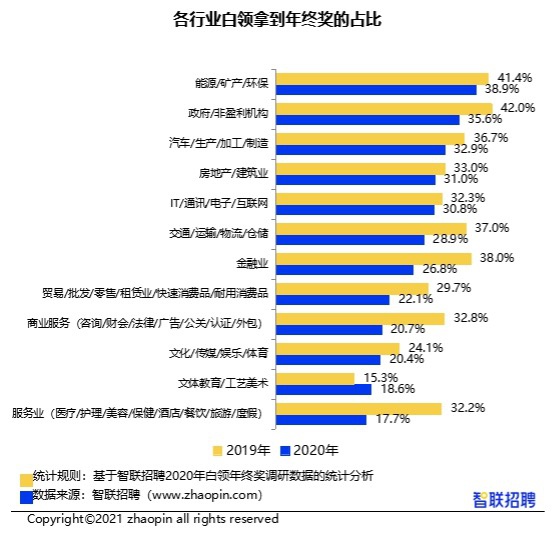 而智聯(lián)招聘提供的《2020 年白領(lǐng)滿意度指數(shù)調(diào)研報告》則顯示,2019 年,文體教育 / 工藝美術(shù)行業(yè)拿到年終獎的白領(lǐng)比例為 15.3%,在 2020 年這一比例升至 18.6%,是唯一實現(xiàn)正增長的行業(yè)。