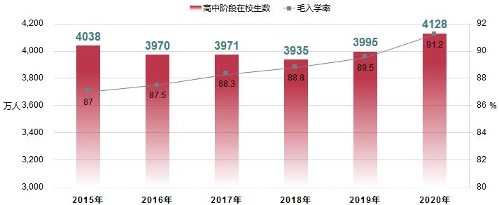 2020年,全國高中階段共有學(xué)校2.44萬所。招生1504.00萬人,在校生4127.80萬人。高中階段毛入學(xué)率91.2%。
