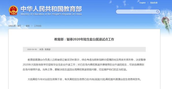 教育部港澳臺辦負責(zé)人日前接受記者采訪時表示,綜合考慮當(dāng)前新冠肺炎疫情防控及兩岸關(guān)系形勢,決定暫停2020年大陸各地各學(xué)歷層級畢業(yè)生赴臺升讀工作;對已在島內(nèi)高校就讀并愿繼續(xù)在臺升讀的陸生,可依自愿原則在島內(nèi)繼續(xù)升讀。當(dāng)務(wù)之急,要解決陸生返回臺灣高校就讀受阻問題,切實維護他們的正當(dāng)權(quán)益。
