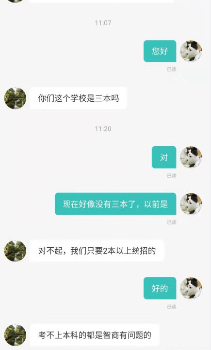 近日,線上招聘平臺(tái),一求職者想投遞杭州某大數(shù)據(jù)公司的產(chǎn)品運(yùn)營崗位時(shí),公司HR詢問其大學(xué)學(xué)歷,并表示他們只招收二本以上的統(tǒng)招,并稱:“考不上本科的都是智商有問題” ,激怒了無數(shù)人。
