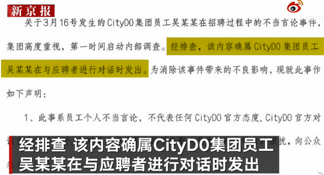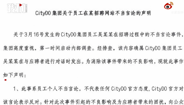 3月16日,CityD0集團(tuán)回應(yīng)員工在招聘網(wǎng)站上稱“考不上本科是智商有問題”。經(jīng)排查,該內(nèi)容確屬CityD0集團(tuán)員工吳某某在與應(yīng)聘者進(jìn)行對(duì)話時(shí)發(fā)出,此事系員工個(gè)人不當(dāng)言論,不代表任何CityD0官方態(tài)度,官方對(duì)該言論表示反對(duì)。