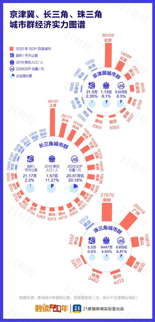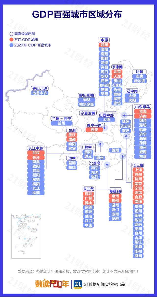 萬(wàn)億城市增至23個(gè),蘇州成為第6個(gè)突破2萬(wàn)億的城市,東莞離萬(wàn)億俱樂(lè)部一步之遙,東莞之后即為山東煙臺(tái)與江蘇常州,去年GDP為7800多億。TOP10城市中,南京超過(guò)天津首次躋身前十,杭州超過(guò)武漢前進(jìn)一名。百?gòu)?qiáng)名單變化不大,云南曲靖、福建龍巖、四川宜賓3個(gè)城市新進(jìn),其中曲靖在百?gòu)?qiáng)城市中增速第一,達(dá)到6.6%;上升名次也最多,前進(jìn)了12名。退出百?gòu)?qiáng)榜的則是河南焦作,以及內(nèi)蒙古的呼和浩特和包頭。焦作GDP同比大幅下降20.6%,從2019年的96位跌至2020年的135位,驟降39名。區(qū)域經(jīng)濟(jì)日益展現(xiàn)出抱團(tuán)對(duì)壘的陣勢(shì),23個(gè)萬(wàn)億GDP城市中,8城屬于長(zhǎng)三角城市群;珠三角9市中有8個(gè)進(jìn)入百?gòu)?qiáng)榜。中西部城市復(fù)蘇勢(shì)頭明顯,沿海地區(qū)受外貿(mào)影響較大;與2019年相比,貴州、云南無(wú)城市名次下跌,湖南僅張家界下降一位。逾九成城市增速為正,浙江舟山領(lǐng)跑全國(guó),2020年GDP增長(zhǎng)12.0%。延續(xù)2019年態(tài)勢(shì),經(jīng)濟(jì)增速20強(qiáng)城市中有一半左右來(lái)自廣西、云南。“十四五”規(guī)劃綱要中提出,發(fā)展壯大城市群和都市圈。具有集聚效應(yīng)的城市群和都市圈逐漸成為經(jīng)濟(jì)發(fā)展新動(dòng)能。
