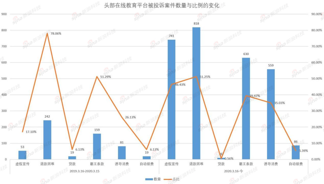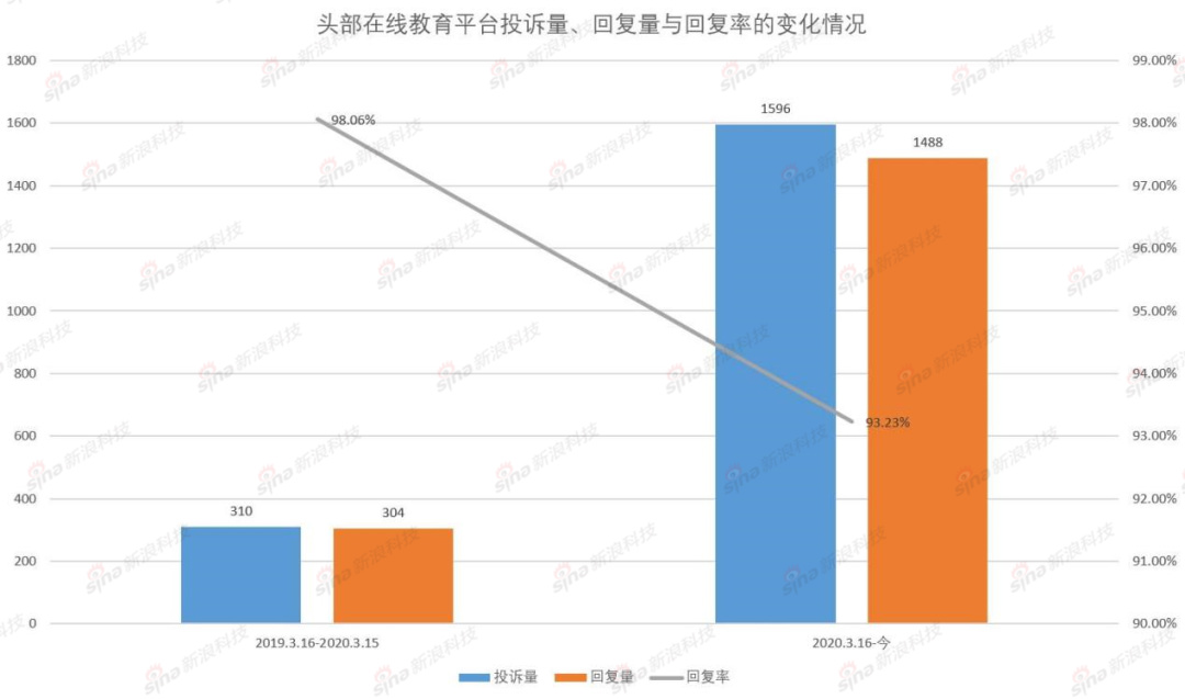 消費(fèi)者服務(wù)平臺(tái)黑貓獲取的數(shù)據(jù)顯示,在教培領(lǐng)域的5家頭部平臺(tái)(好未來、作業(yè)幫、猿輔導(dǎo)、跟誰學(xué)、VIPKID)中,從2019年3月16日到2020年3月15日產(chǎn)生的投訴總量為310起,而2020年3月16日至今則為1596起,增長(zhǎng)了414.84%。