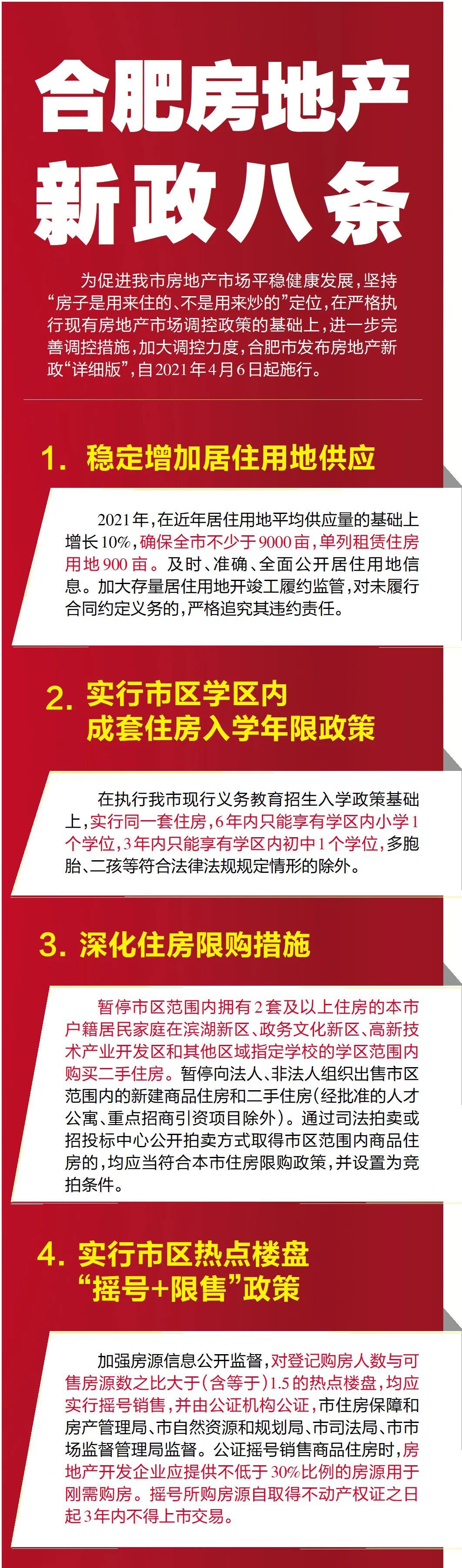 2021-04-06 09:44:18閱讀()合肥日?qǐng)?bào)合肥市發(fā)布房地產(chǎn)“新政八條”,涵蓋學(xué)位制、二手住房限購(gòu)、熱點(diǎn)樓盤(pán)“搖號(hào)+限售”等八個(gè)方面。新政自2021年4月6日起施行。