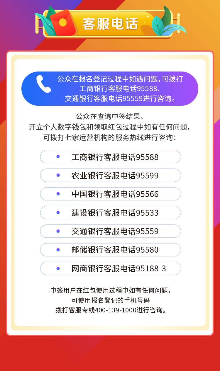 答:經(jīng)國務(wù)院批準(zhǔn),人民銀行組織部分商業(yè)銀行和有關(guān)機構(gòu)共同開展數(shù)字人民幣體系的研發(fā),根據(jù)本次活動的試點準(zhǔn)備情況,目前工行、農(nóng)行、中行、建行、交行、郵儲和網(wǎng)商銀行七家運營機構(gòu),已具備參與此次紅包活動的條件,其他參研機構(gòu)正在積極進行研發(fā)。