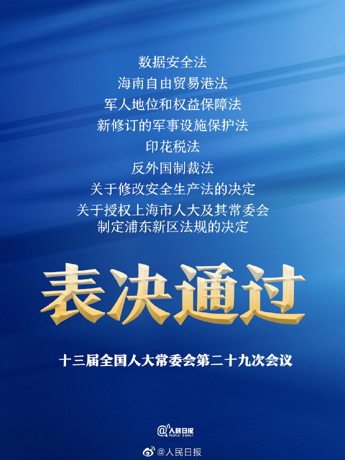 2021-06-10 23:06:34閱讀()人民日報今天,十三屆全國人大常委會第二十九次會議表決通過數(shù)據(jù)安全法、海南自由貿(mào)易港法、軍人地位和權(quán)益保障法、新修訂的軍事設(shè)施保護(hù)法、印花稅法、反外國制裁法、關(guān)于修改安全生產(chǎn)法的決定、關(guān)于授權(quán)上海市人大及其常委會制定浦東新區(qū)法規(guī)的決定等法案及決定。(央視)
