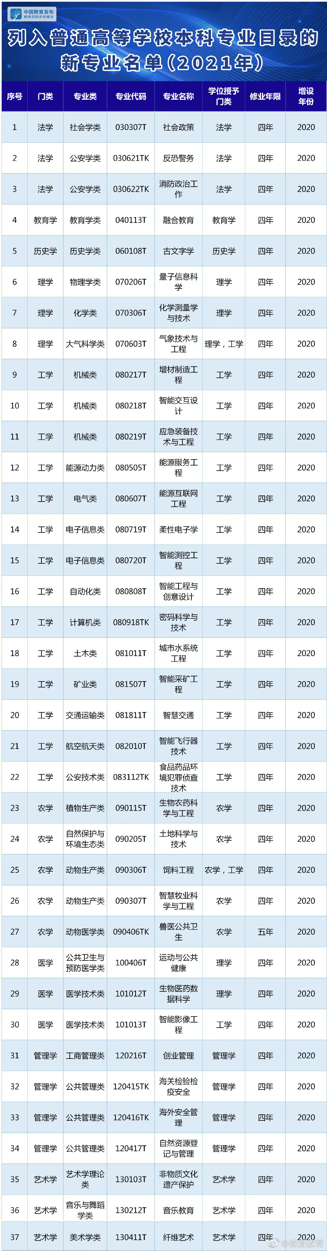 2021-06-27 11:13:41閱讀()央視新聞教育部最新版高校招生專業(yè)目錄中,今年新增37個本科專業(yè),其中約1/3是電子信息類和人工智能類,包括智能采礦、智慧交通等。近年來大類招生成趨勢,即先進(jìn)行一年的通識教育、再確定專業(yè)方向,填報此類志愿時,要多了解專業(yè)分流方式和相關(guān)的轉(zhuǎn)專業(yè)政策↓祝大家都能進(jìn)入心儀的大學(xué)!