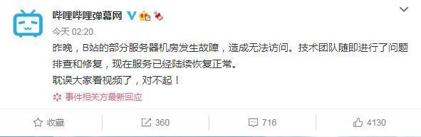 今天凌晨(7月14日)2點(diǎn),嗶哩嗶哩彈幕官微更新動(dòng)態(tài)稱“昨晚,B站的部分服務(wù)器機(jī)房發(fā)生故障,造成無法訪問。技術(shù)團(tuán)隊(duì)隨即進(jìn)行了問題排查和修復(fù),現(xiàn)在服務(wù)已經(jīng)陸續(xù)恢復(fù)正常。”